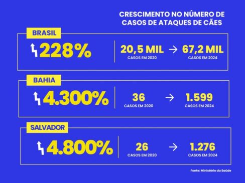 cena de uma criança de quatro anos sendo atacada, no último domingo (21), por um cachorro da raça pitbull enquanto brincava na porta de casa, em Itabuna, no sul da Bahia, gerou forte repercussão e acendeu o alerta sobre a frequência desses casos. Ela não foi um caso isolado e a sensação de que ataques de cães estão se multiplicando não é ilusão. Dados do Ministério da Saúde confirmam uma escalada preocupante: os atendimentos ambulatoriais por mordidas de cachorro no Brasil subiram de 20,5 mil em 2020 para 67,2 mil em 2024, um aumento próximo a 228%.