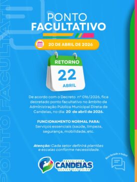 Os servidores públicos de Candeias terão ponto facultativo na próxima segunda-feira (20), véspera do feriado nacional de Tiradentes, celebrado em 21 de abril.